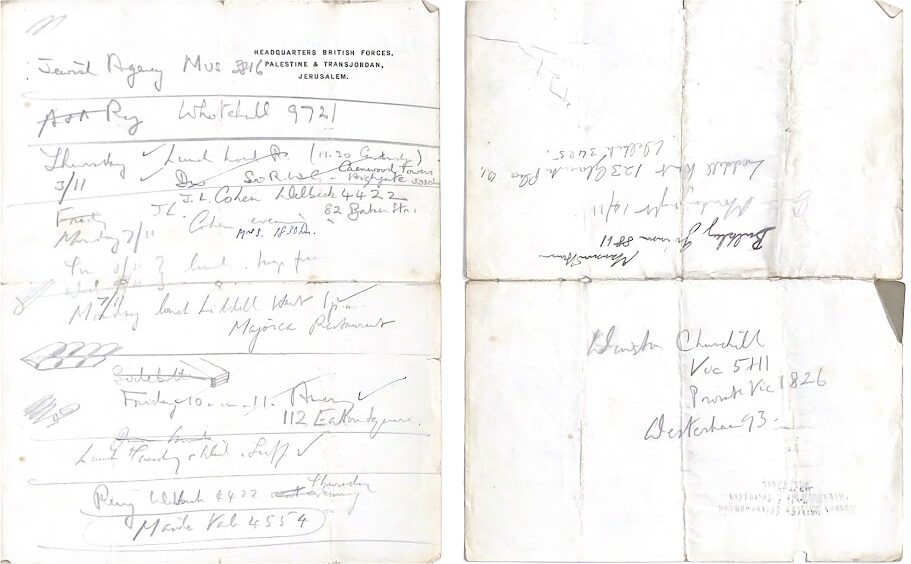 Список телефонных номеров, написанный рукой Вингейта, включающий номера канцелярии и прямые линии Уинстона Черчилля. Коллекция Орда Вингейта, Национальная библиотека Израиля. Share Tweet Share