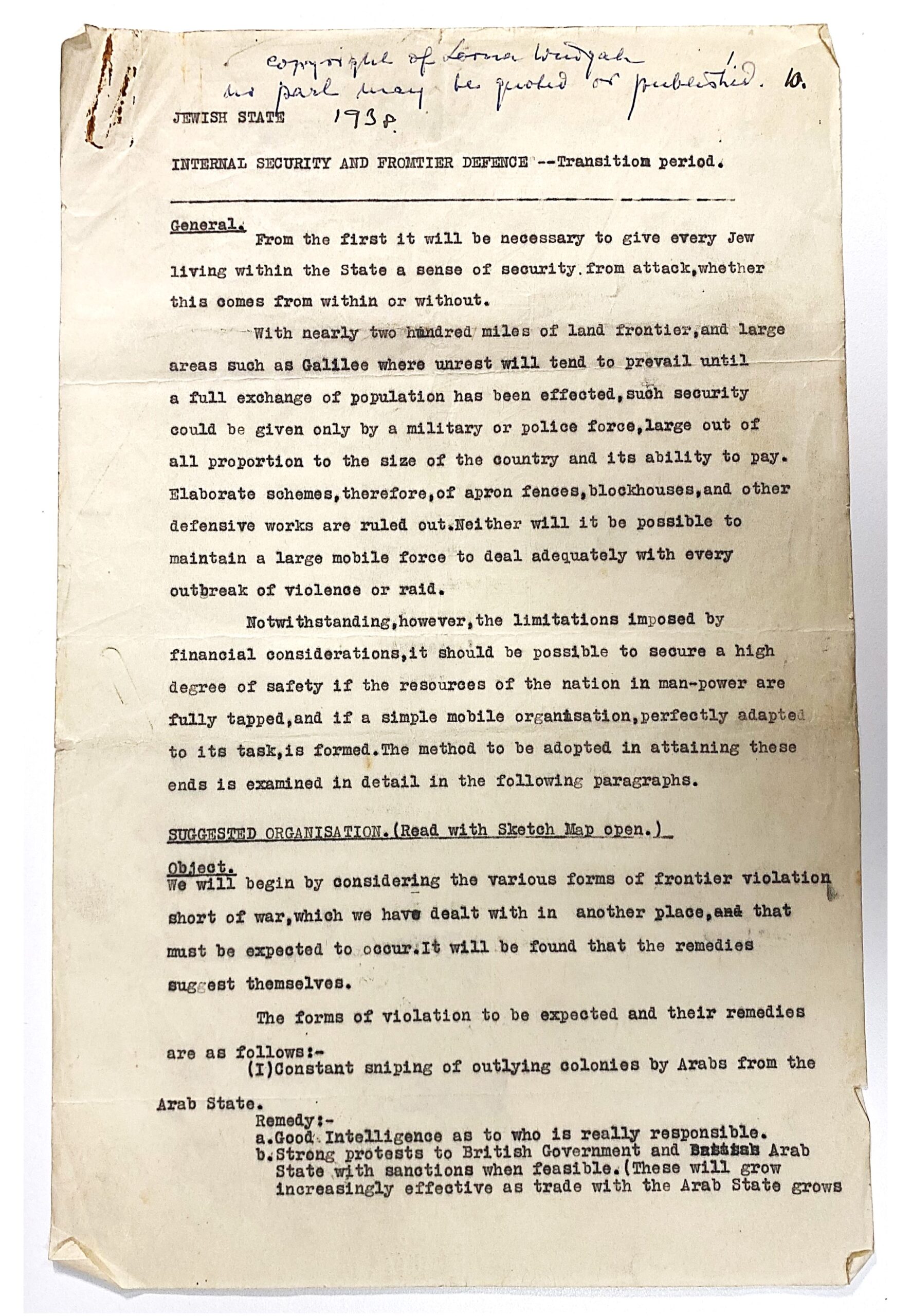Избранные страницы изи12-страничного документа 1938 года, в котором изложены планы Вингейта по обороне еврейского государства, включая пехоту, военно-воздушные силы, внутреннюю безопасность, использование женщин в армии и развитие местной сталелитейной промышленности. Коллекция Орда Вингейта, Национальная библиотека Израиля.