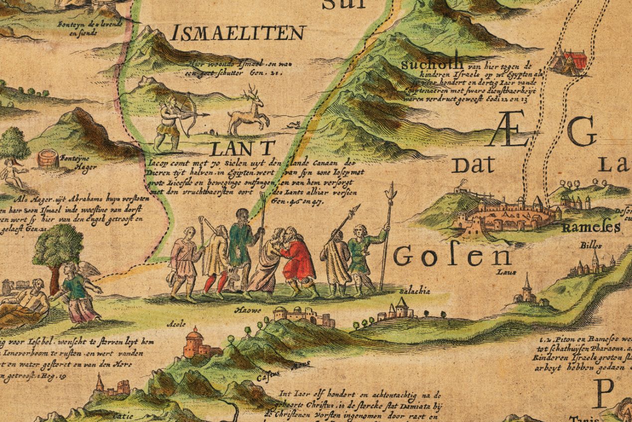 Это воплощено, например, в карте около 1700 года, приписываемой голландскому гравёру и издателю Юстусу Данкертсу старшему и его сыну и коллеге Корнелису Данкертсу младшему, который, по имеющимся сведениям, был особенно искусен в гравировке и травлении картографических досок. Работа под названием «Новая карта Земли обетованной», о которой в подписи к экспонату сказано, что она была вдохновлена неким Яном ван Дутекумом младшим, умершим в 1630 году, демонстрирует береговую линию, идущую, словно по широте, при этом восток указывает туда, где мы ожидали бы видеть север.