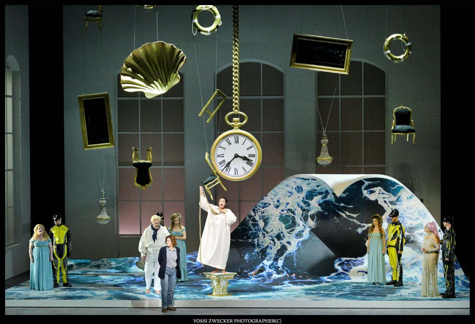Одновременное исполнение трагедии и комедии создает путаницу как для актеров, так и для зрителей. Следовательно, никто точно не знает в какой момент, горевать или смеяться. Эта постоянная путаница создает отличную динамику на фоне поющих нимф, бесконечных переодеваний, яркой сценографии, моря, роскоши, на фоне волшебного сочетания современного и классического, сериа и буффа, техники и технологии, которое радует; и вновь – музыки плавной, величавой, волнующей, смешно , умной – все эпитеты пригодятся. В музыке Шрауса – одновременно причудливой и великой – вся история и комическая, и драматическая. Кажется, что в самой музыке есть и слова – но нет, их все-таки отлично пропели вчера на предпремьерном показе солисты этой постановки.