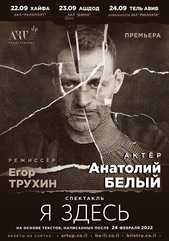 «Я здесь» – это спектакль – размышление, спектакль – разговор о нашем времени и о человеке в этом времени. Как в одном разговоре могут сочетаться слёзы и смех, добро и горе, свет и горечь, так и в этом спектакле говорится о человеке, о нас о всех и о времени, в котором мы живем. Премьера спектакля «Я здесь» пройдет в Израиле 22, 23 и 24 сентября. Этот спектакль – трагикомедия, как и вся наша жизнь. И это спектакль о силе человеческого духа. И обо всем этом рассказывает Анатолий Белый в интервью в преддверии премьеры.