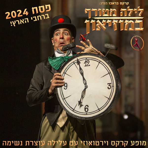 Цирковое шоу «Безумная ночь в музее» раскрывает ночные тайны. Международный спектакль с коллективом цирковых артистов из разных стран мира возвращается после пандемии на сцены Израиля. Летающие акробаты, гуттаперчевые гимнастки, жонглеры и эквилибристы. Что они делают ночью в музее? Они играют в цирк… Во многих городах страны – с 16 по 29  апреля 2024 года. Утренние, дневные и вечерние представления – на выбор для всей семьи.