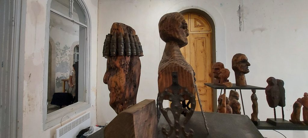 Ушли – как уходят и убегают беженцы нашего времени, беженцы 2022 года. Фигуры на волне – это очередь в аэропортах или портах перед паспортным контролем, очередь за помощью, зигзаг лабиринтов, очередь на выход, очередь на вход, выплескивающаяся в коридор, где выставка продолжится на помосте-корабле, где ждут своего часа побега крысы. И на старой, времен британского мандата, гладильной доске, где будут стоять столь же старые утюги, на гладкой поверхности которых выгравированы портреты старых людей. В общей сложности на выставке «Приливы и отливы» представлены 80 экспонатов – удивительных экспонатов каждый по отдельности и еще более удивительных вместе, собранных в пространстве галереи, которое – пространство – также становится частью рассказа.Все 60 деревянных фигур – топорная работа. В прямом смысле слова. Каждую деревяшку надо было расшифровать, вырубить из них историю. Инструментами были топор, наждачная бумага, масло. Задачей Макса Эпштейна стало разгадать и оживить образы, уловить характер, состояние, превратить дерево в людей-рассказчиков, «находящихся то ли в эйфории, то и в напряжении, в предчувствии страха. Никто не знает, каким было их прошлым, каким будет их будущее, мы их видим здесь и сейчас в настоящем времени». То, что все фигуры вырублено топором, придет им брутальность, жесткость. Здесь нет тонких деталей, а есть напряженность, которая и держит мост-волну в воздухе, а арки из арматуры просто к ним привязаны – к воде и к воздухе.