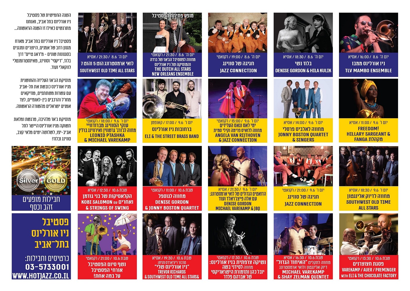 В фестивале в этом году примут участие десятки джазовых исполнителей, выступающих на джазовых фестивалях по всему миру и специализирующихся на музыке Нового Орлеана. К веселой вечеринке также присоединятся израильские музыканты. Всего же в этот фестивале, который пройдет с8 по 10 июня в Тень-Авивском музее искусств и на площади перед ним, участвуют более 100 исполнителей и прозвучит традиционный джаз с индивидуальным подходом, прекрасными аранжировками и превосходными импровизациями…