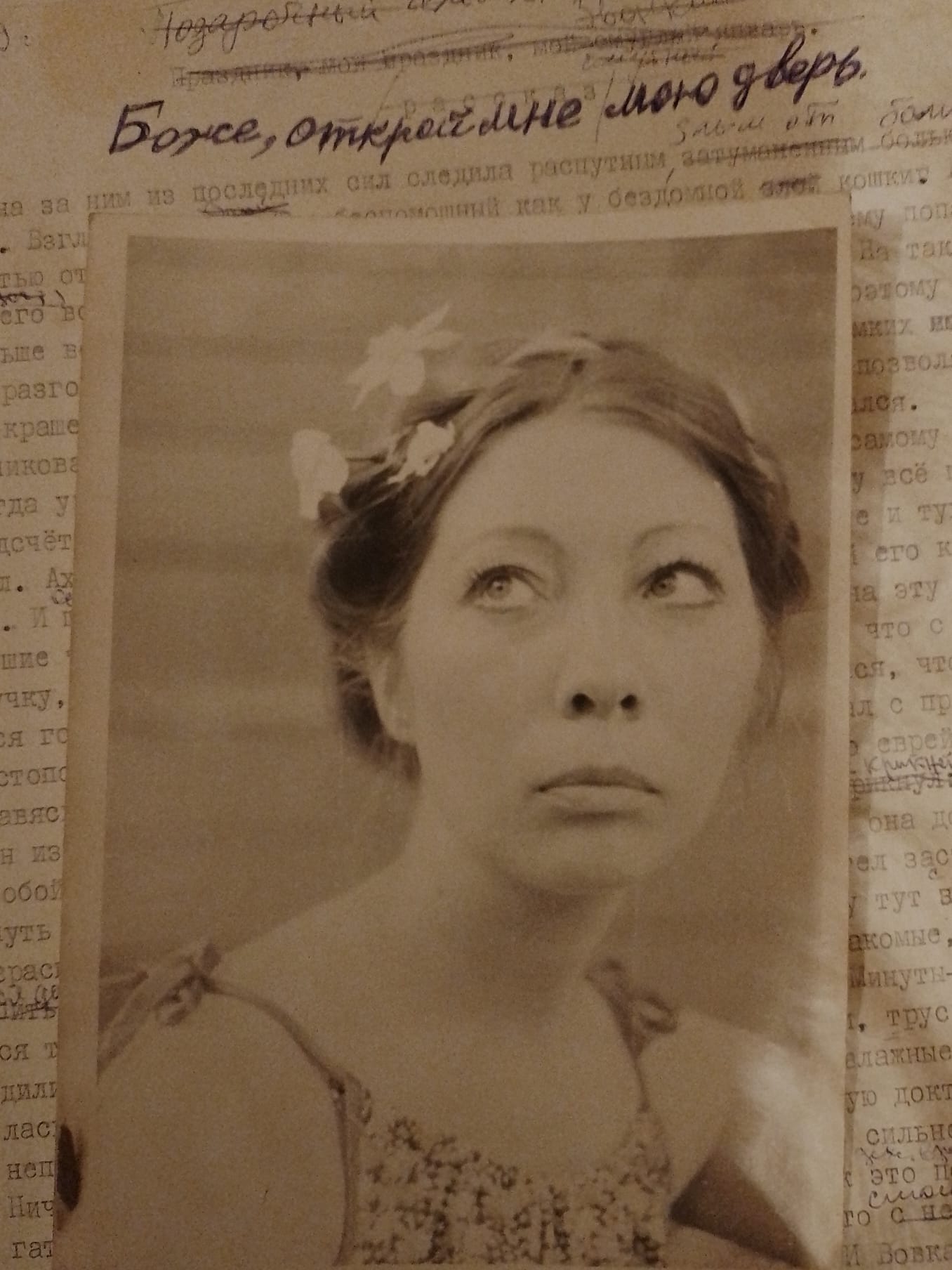 Нина Садур, времён написания “Панночки”. Фотография лежит на рукописи её раннего романа. Фото из личного архива.