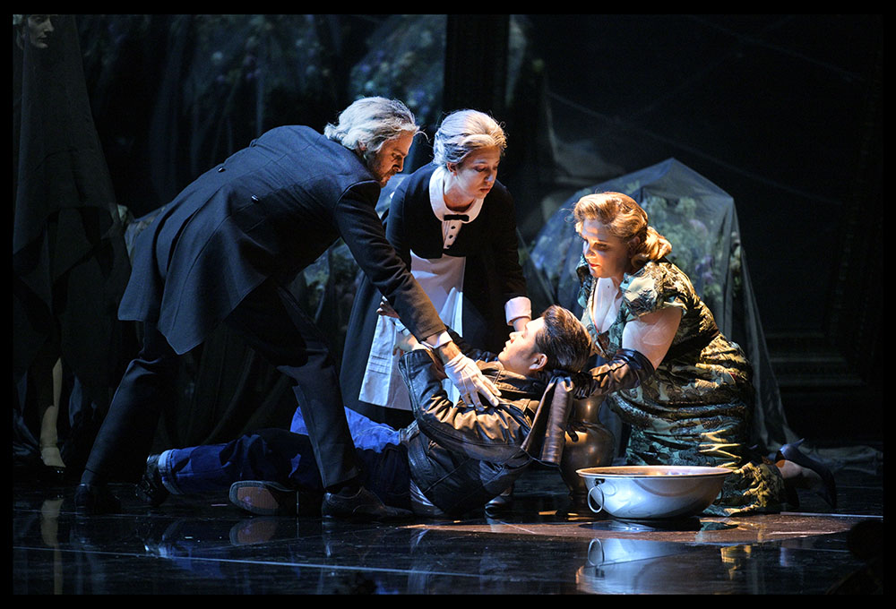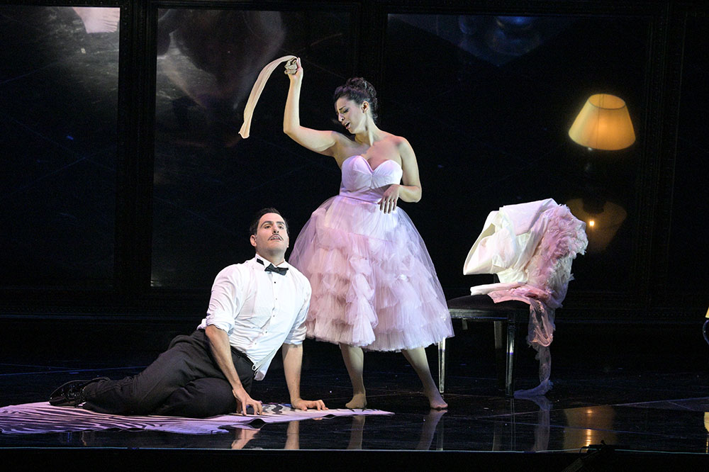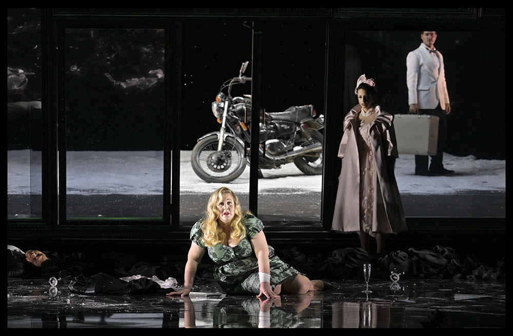 Возникают за сценой зеркала, делящие мир оперы. Оркестр в яме и второй, где-то там, в зазеркалье. И герои там, и зрители, и видео-фантомы, и никого этот дуализм не спасает.