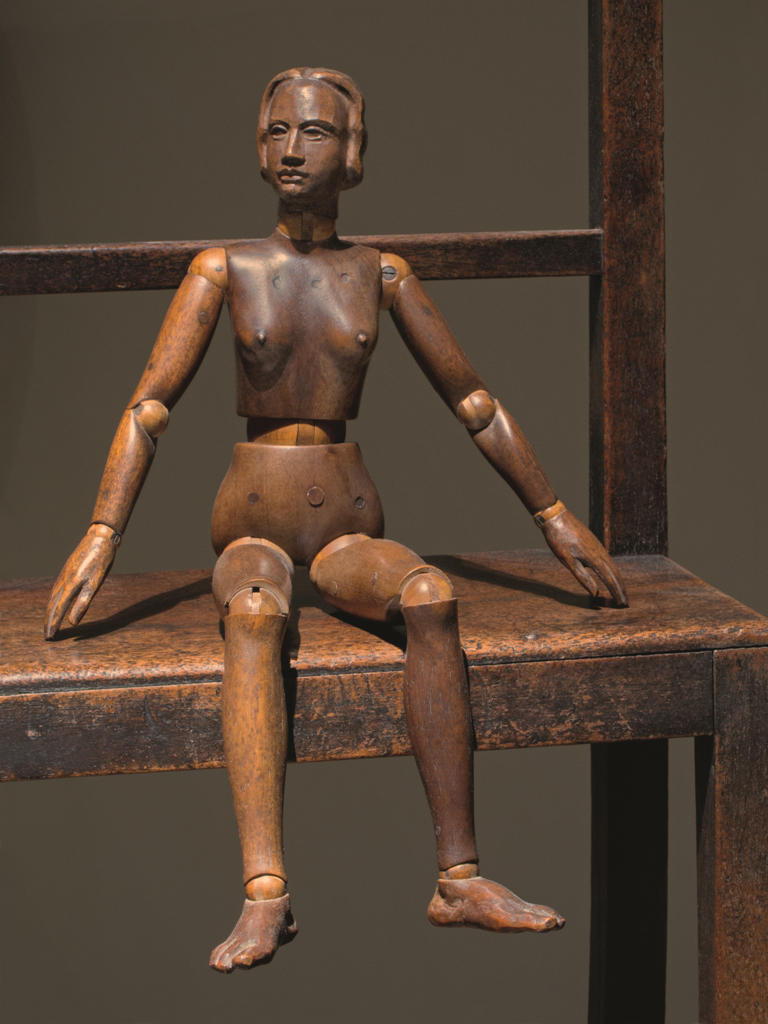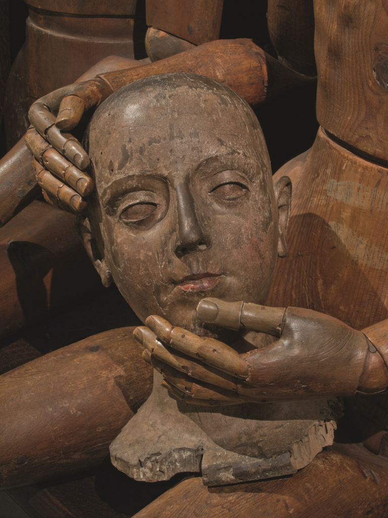 Деревянные сны были задуманы Идессой Хенделес– немецко-польско-еврейского происхождения художницы, перебравшейся еще в детстве с родителями в Канаду – в 2013 году. Они апокрифичны, полны христианских и проче-религиозных аллюзий, ассоциаций со Святой Вероникой и ее платом и умением превратить любую нишу в склеп, если того требует концепция. А концепция в данном случае отталкивается от собранной Идессой за 20 лет уникальной коллекции из 150 деревянных манекенов для художников – кукол с руками-ногами-головой на шарнирах, напоминающих анатомическое пособие. Куклы Идесса собрала от весьма древних, начиная с 1520 года, до просто старых, сделанных в 1930-м году. Размеров – от крохотных, величиной с ладонь, до манекенов в рост человека. Зрители такой выставки-инсталляции напоминают прохожих, втянутых в некий спектакль, или, уж если использовать кураторские термины, перформанс. Где зал и где сцена, где вуайеры и где актеры – не сразу и разберешься, глядя на эти композиции, напоминающие «живые картины» – tableaux vivants, искусство, имитирующее жизнь. Может быть, эти пространства существуют в ее воображении? Возможно, это дом ее памяти, псевдо-семья, рассаженная по ранжиру, армия кукол, зал суда, урок анатомии в классе рисования или анатомический театр, подсмотренные неловкие комические сцены, греческий бог из машины, балаган деревянного стриптиза, вещи в парадоксальных витринах, куклы-автоматы из сказок Гоффмана (Олимпия из его «Песочного человека») или сказаний Фрейда, мир ее снов, в который нас пригласили? Или то многослойная медитация над предметами из прошлого, призванными помочь понять настоящее, смешение кураторства и art-making? Торжественное собрание при интригующих обстоятельствах, аукцион, в котором все внимание сосредоточено на одном манекене. Небольшая, но собственная вселенная. И как все это соотносится с Катастрофой?