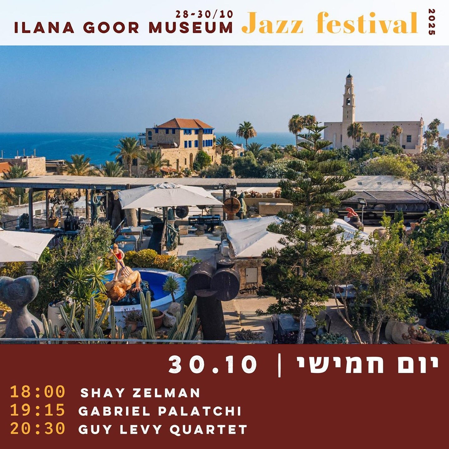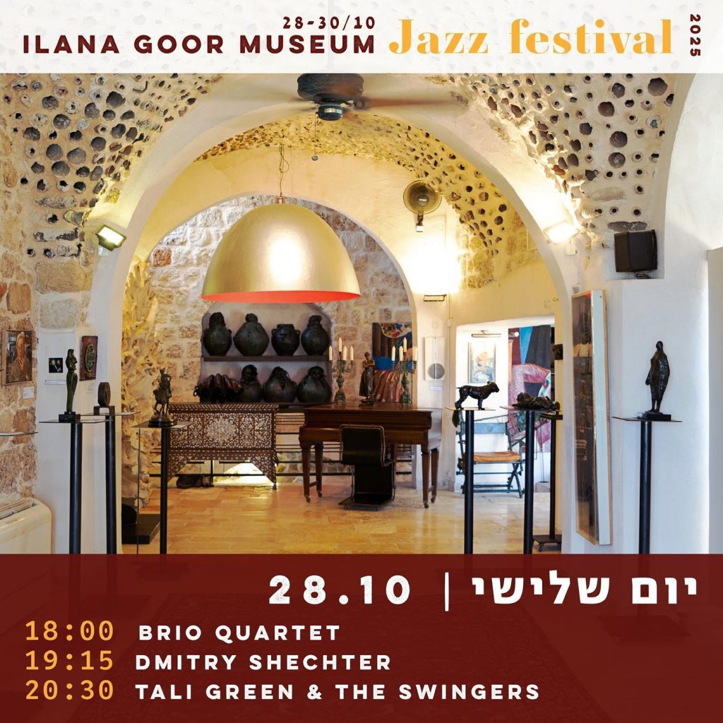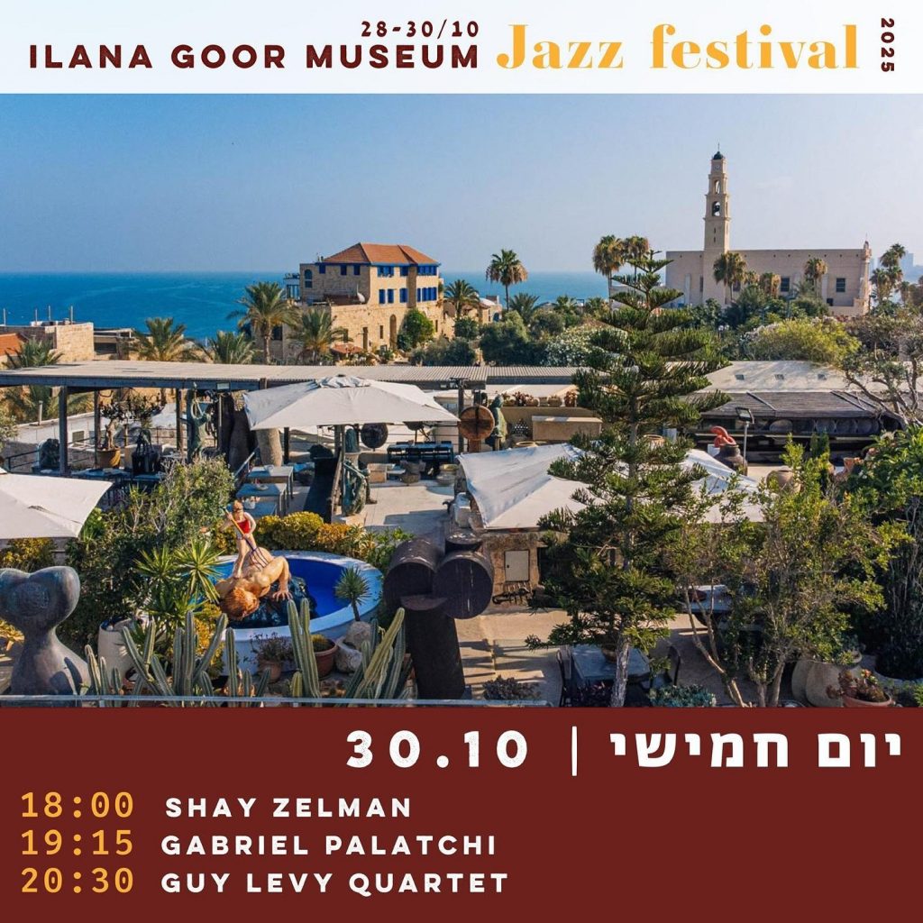Фестиваль джаза 2025 Jazz on the Roof стартует! Три дня джаза в музее Иланы Гур – квартеты, инструментальные и вокальные трио, сольное фортепиано. Джаз, волны, бриз, вино и свобода. 28–30 октября, ежедневно с 18:00 до 22:00 на крыше музея, с видом на море, и в залах музея, среди произведений искусства и редких коллекций.