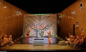 Инбаль Пинто превращает каждый фрагмент бытования на сценических подмостках, каждое мгновение действия в отдельный спектакль. Ее идей хватило бы на множество проектов. Акробаты, балет, придумки вроде хлопушки, которая выстреливает клоуном, куриные окорочка, которые оживают и смешно суетятся, одушевленные кубики… Костюмы и сценография, созданные ею, поражают; она словно боится не успеть, не осуществить. Насыщенность фантазии режиссерши зашкаливает, концентрация избыточна – может, всего этого богатства даже многовато, для меня – точно слишком много, потому что музыка  отходит на второй план.