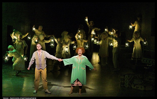 Жители этого сказочного городка – этакие говоруны-жевуны, они же зрители. Они же еще и  сами куколки-комедианты.  Возможно, меня  именно это и озадачило, не тронуло, не убедило –  дважды во время просмотра новой работы Израильской оперы.  Если нет перехода от человека, личности, пусть грешной, слабой, жестокой,  к статусу куклы, героя кукольной комедии, а есть только кукла –  с самого начала и до финального вскрика,  – то нет и сострадания.