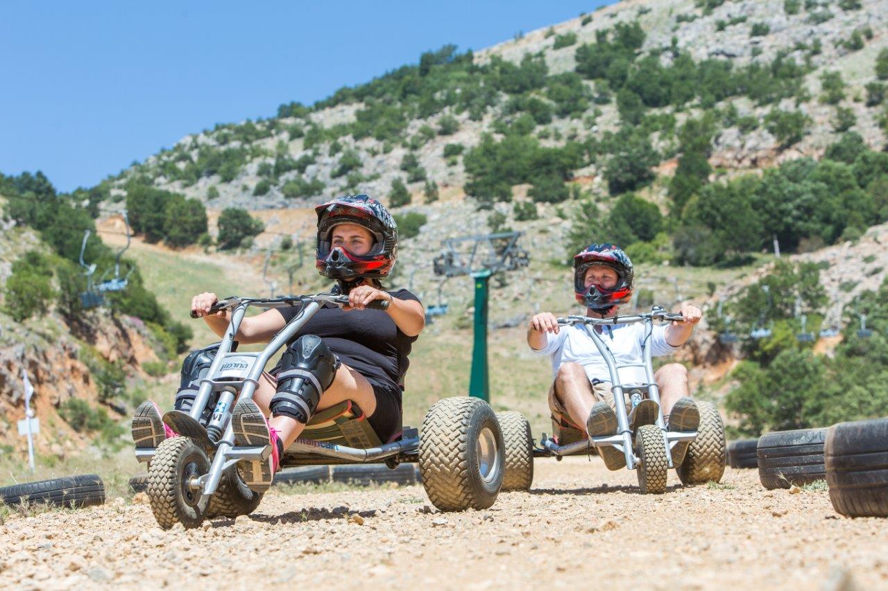 Еще одна аттракция курорта Хермон – картинг – катание на трехколесных квадроциклах по специально подготовленным горным тропам с высоты 850 метров. У квадроциклов нет мотора, но их проходимость по горной дороге велика. На таком квадроцикле можно кататься с 16 лет, он абсолютно безопасен, развивает хорошую скорость и прекрасно подходит для любителей активного отдыха. На стартовую точку спуска поднимаются на канатной дороге, надевают каску, и с ветерком скатываются вниз.