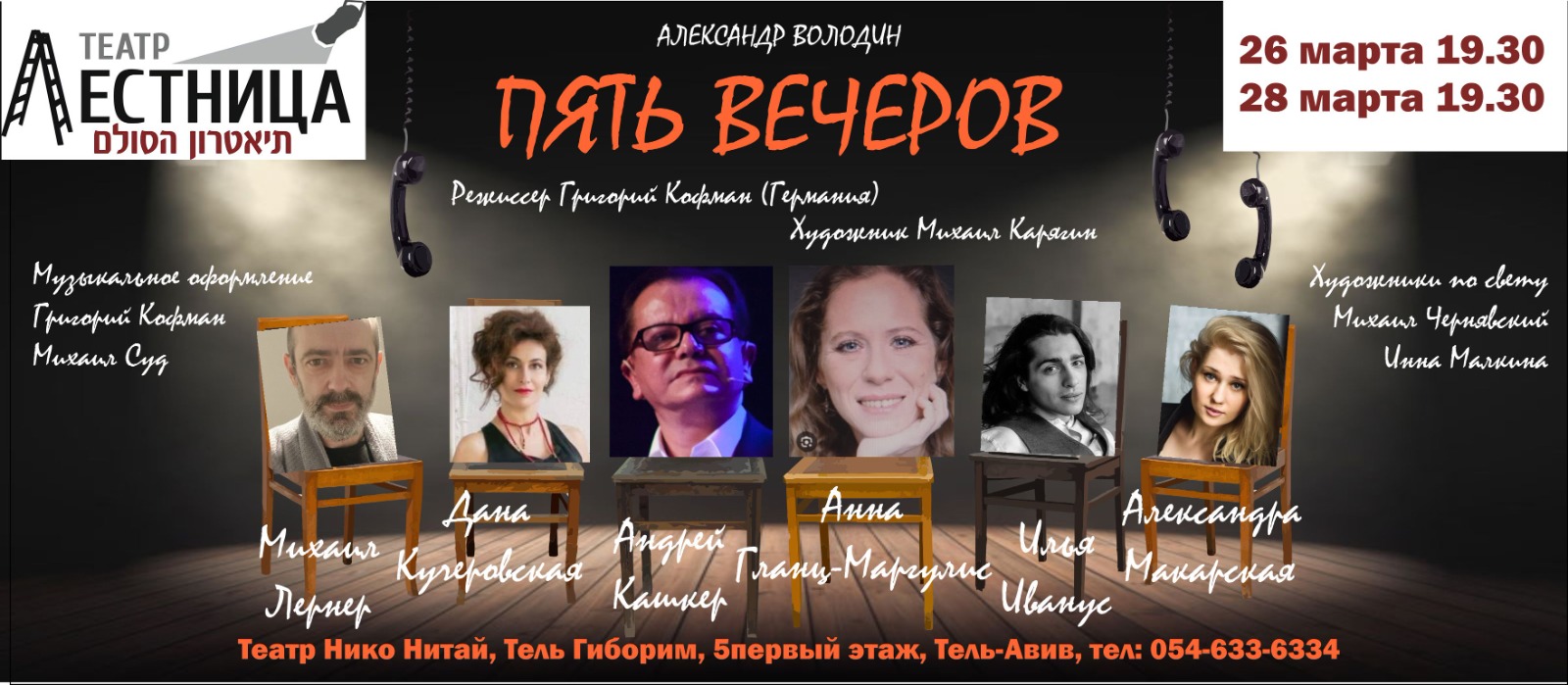 Театр “Лестница” приглашает на спектакль по легендарной пьесе Александра Володина “Пять вечеров”. Спектакль пройдет в Тель -Авиве, в зале Театре Никко Нитая, по адресу: Тель-Гиборим 5Режиссер: Григорий Кофман