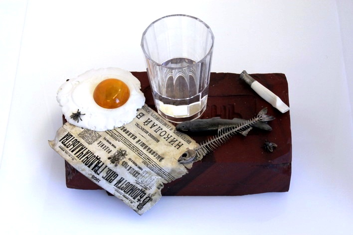 “В нашей совместной работе на тему поп-арта “Манифест 1905 года”, выполненной в виде натюрморта, Юрий Николаевич не пожалел сил на виртуозное выполнение мельчайших элементов: обрывка газеты, мух, ползающих по яичнице из кахолонга и янтаря, окурка около хрустального стакана, скелетика кильки. Все эти элементы, расположенные на плоскости дореволюционного кирпича, сделанного из сургучной яшмы, выглядят настолько натурально, что кажутся реальными, а не выполненными из серебра. Именно натурализм изображения делает композицию истинным поп-артом”.