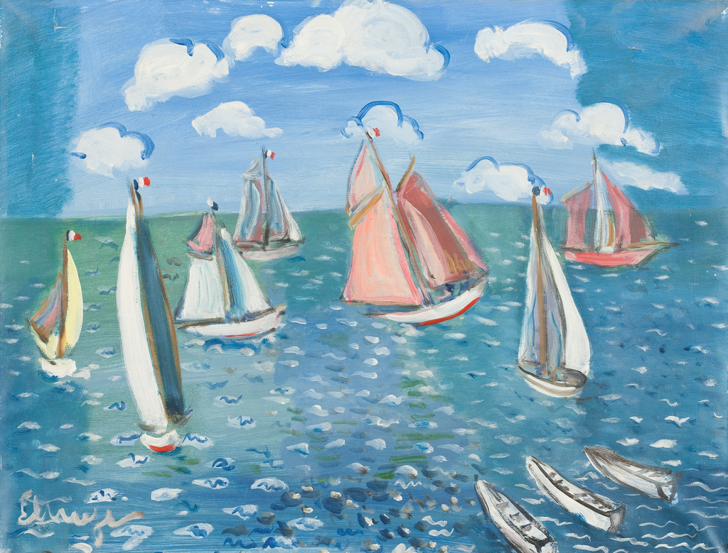 Совсем другая по стилю картина Элмира де Хори “Регата” (1974), стилизованная под работы французского художника, представителя фовизма Рауля Дюфи.