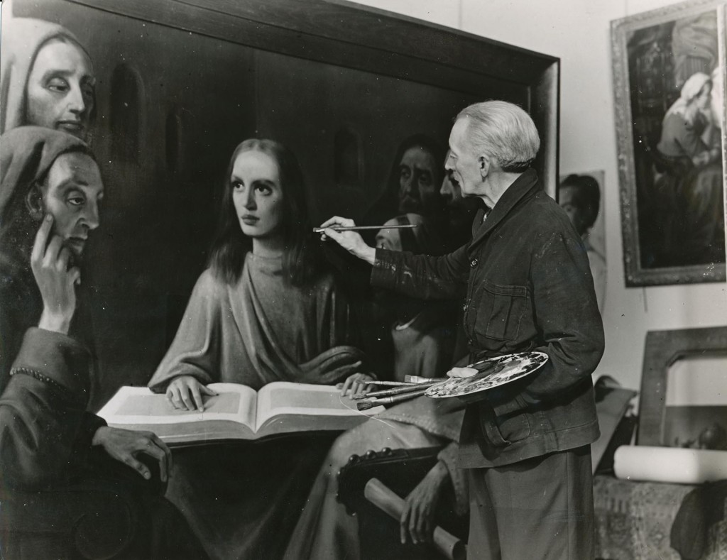 Меегерен углубился в техники старых нидерландских мастеров XVII века Франса Халса, Герарда Терборxа, Питера Хоха и в особенности Яна Вермеера. Меегерен обратил внимание, что среди известных 35 работ Вермеера не было ни одной с религиозными сюжетами, столь распространенными в работах других художников его времени. Он принял парадоксальное решение – написать картину в стиле Вермеера с Христом в центре сюжета. Для первого “Вермеера” художник останавливается на “Христе в Эммаусе”.