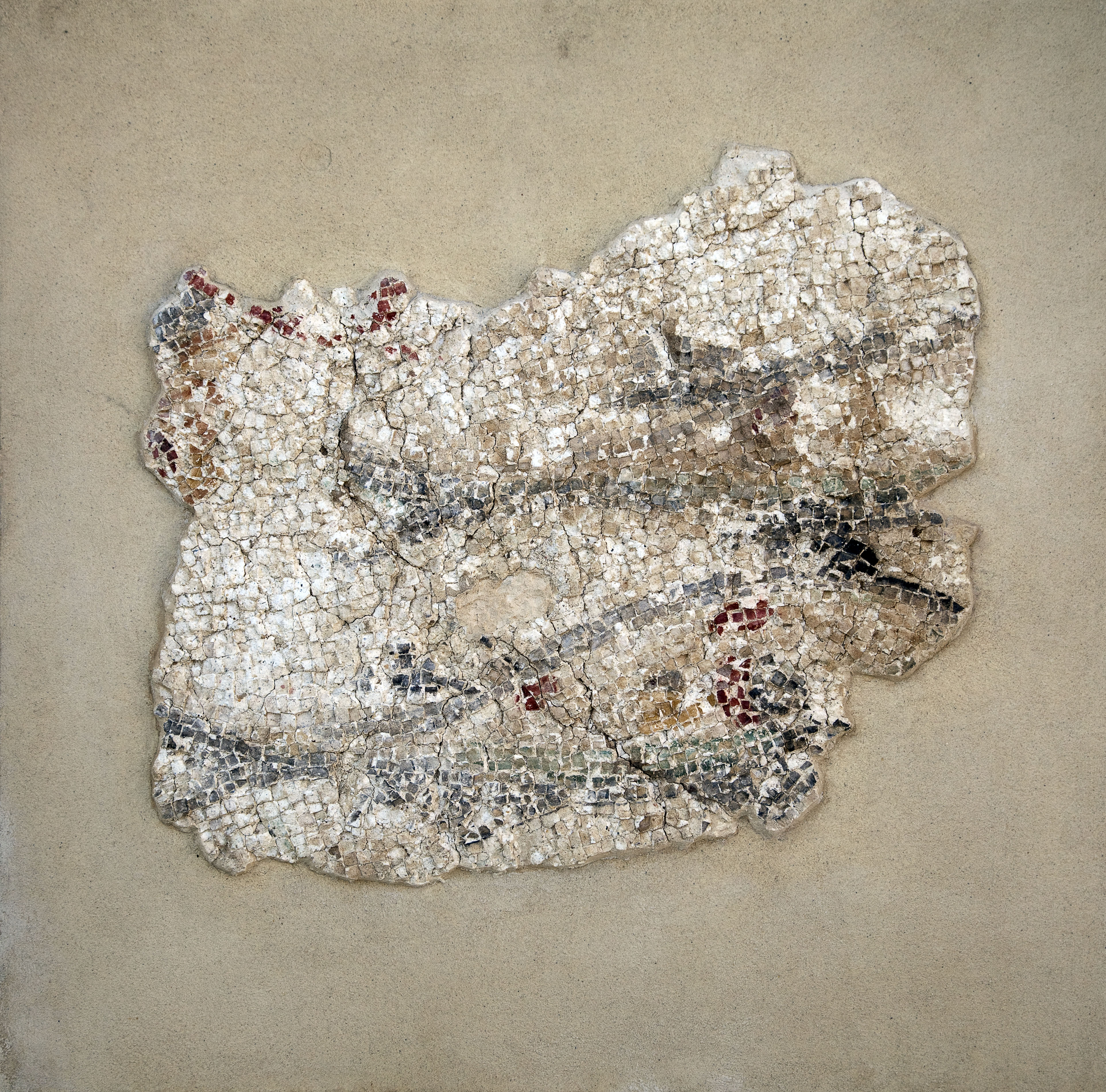 Многочисленные отпечатки босых ног и сандалий 34-44 размеров, оставленных создателями мозаики, были обнаружены на ее четвертом подготовительном слое (рудус).
