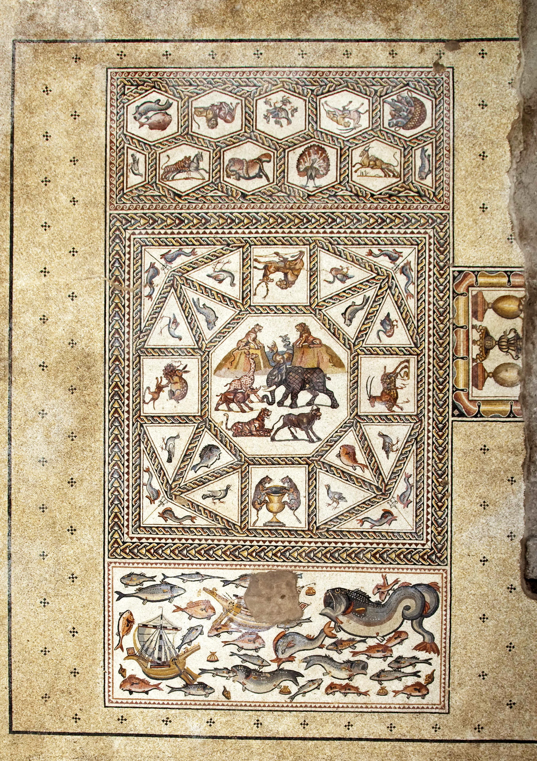 Мозаика площадью почти 160 кв.м состоит из нескольких панно, изображающих различных животных, птиц, рыб, морских чудовищ, парусники и торговые корабли древнеримского периода. Помимо этого,  ее украшают растительные и геометрические орнаменты. Это мозаичный пол великолепной римской виллы, относящейся предположительно к концу III вв. — началу IV вв. н.э. (позднеримский период).