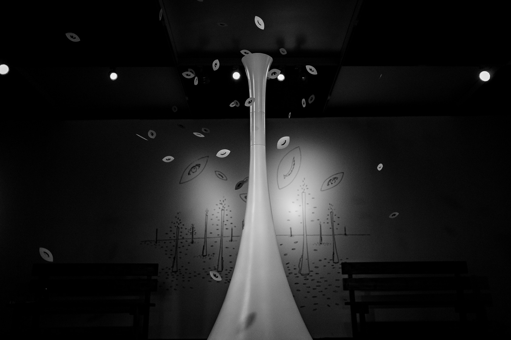 Посетителям предлагается присесть и отдохнуть на скамейках возле работы «Мигающие листья», расположенной в центре зала, таким образом погрузившись в море мигающих листьев, падающих в это время с потолка музея. Помимо ощущения слияния с природой, работа дает возможность представить японскую осень.