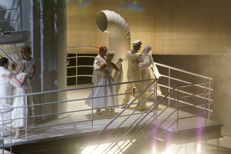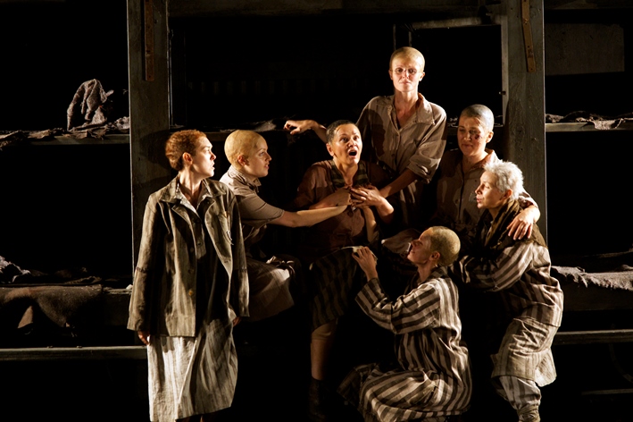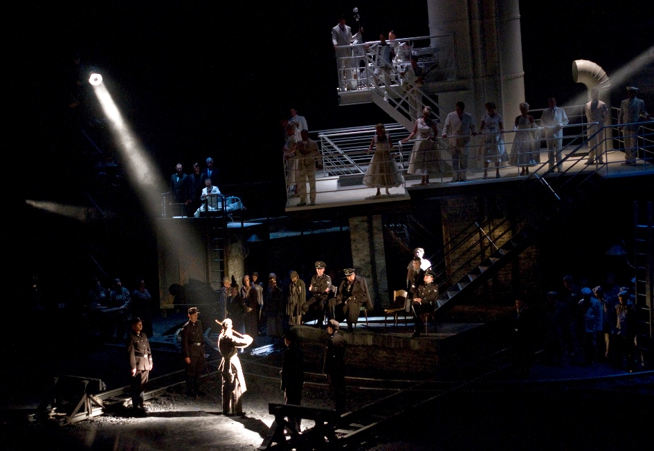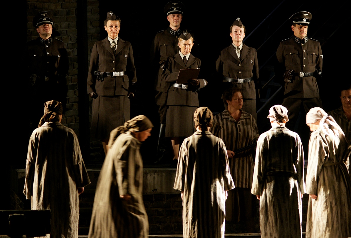 Поначалу сама Посмыш не верила, что тему Освенцима можно представить в музыкальной драме. Но художник Йохан Энгельс из ЮАР придумал идеальную сценическую конструкцию: он разделил пространство по горизонтали на черно-белые плоскости. Наверху – океанский лайнер и все его пассажиры в белом. Внизу – мрачный мир концлагеря, населенный заключенными, надсмотрщицами и офицерами СС. Хор, сидящий на крыше товарного вагона (он же – лагерные нары), оказывается третьим горизонтом сценического пространства, его функции в опере близки к хору в античной трагедии.