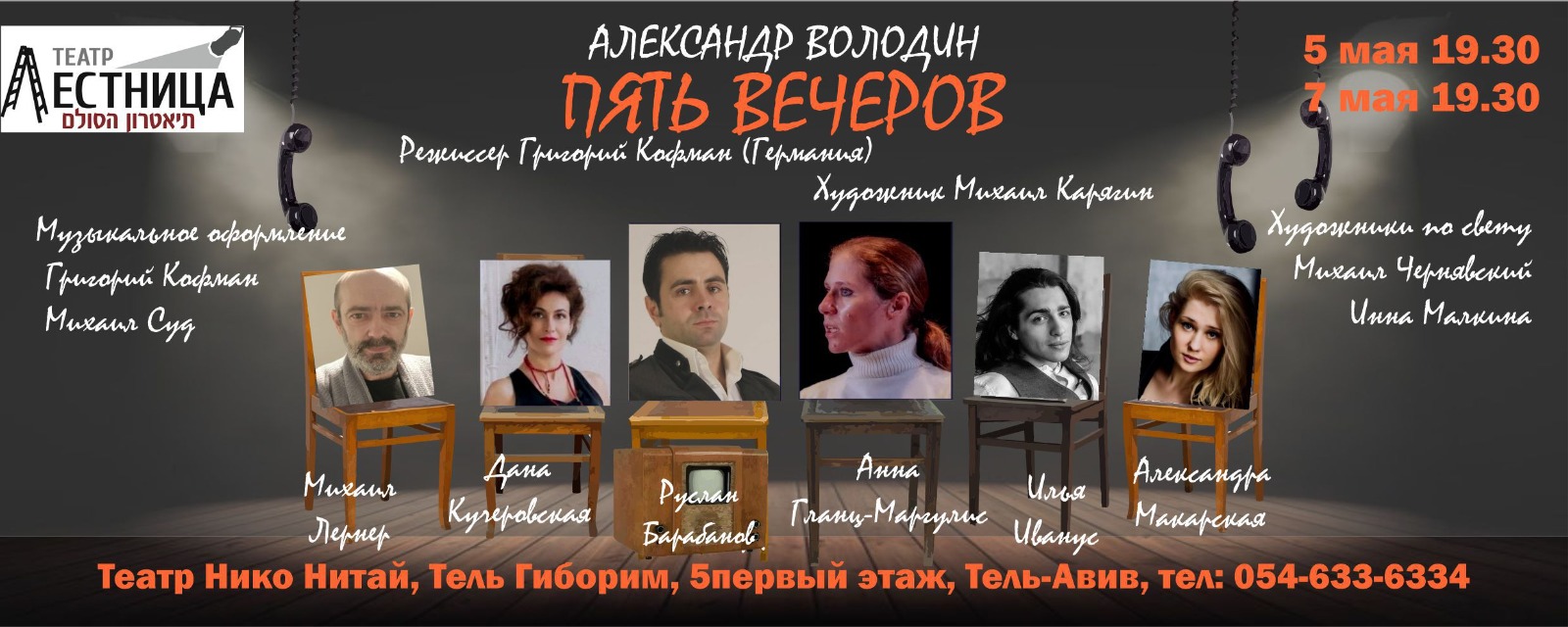 Премьера «Пяти вечеров» состоится 5 и 7 мая 2026 года в 19:30 на сцене театра Нико Нитая (Тель-Гиборим, 5, Тель-Авив, первый этаж). Несколько вечеров. Камерное пространство. Петербургская история в исполнении людей, которые знают её не понаслышке.