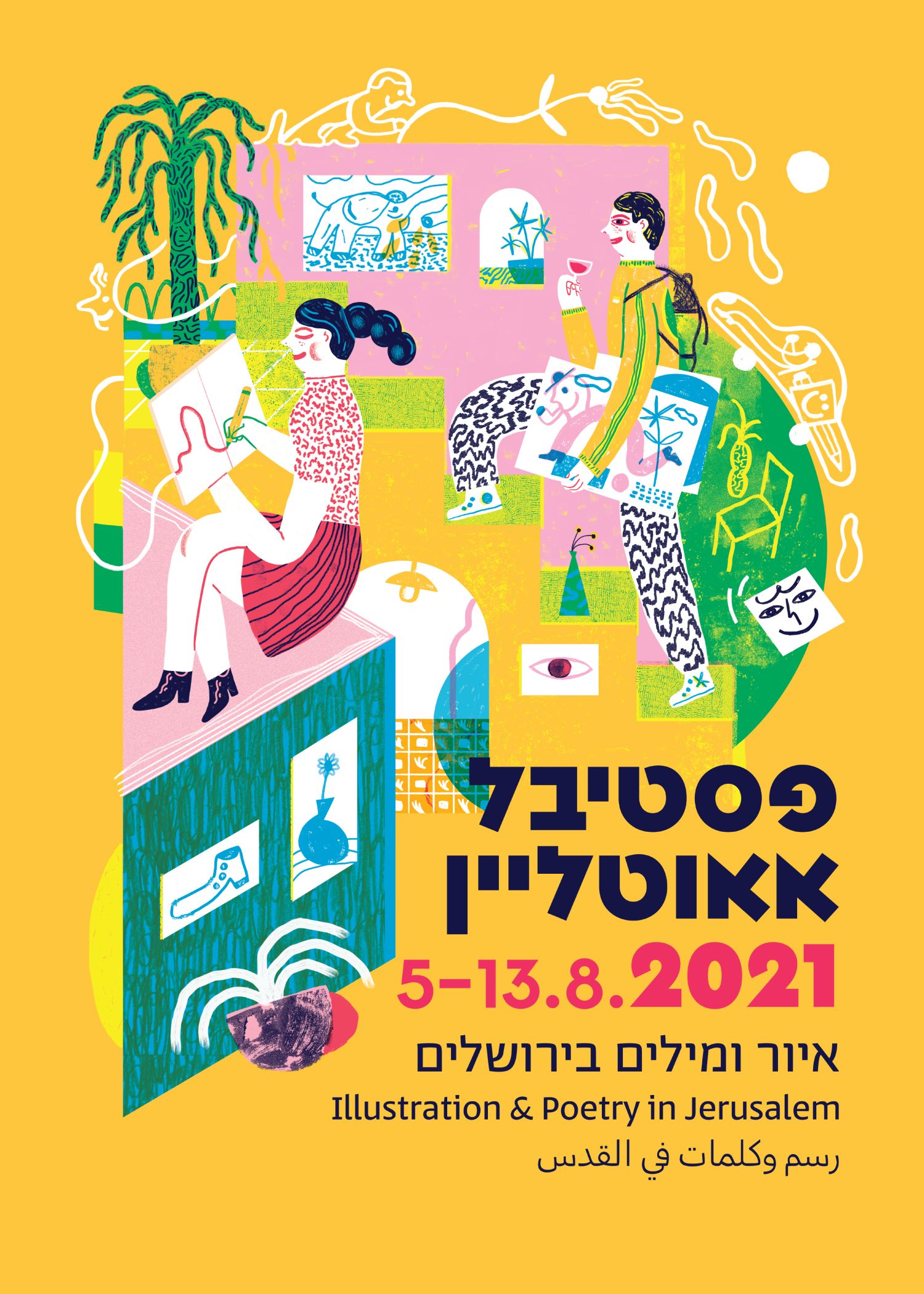 Фестиваль предлагает 14 индивидуальных и групповых выставок, где будут показаны оригинальные интерпретации выбранной сверх-темы «Пласты». Необыкновенные впечатления от странствий по Иерусалиму, вдоль главной артерии города – улицы Яффо, межжанровые коллаборации художников, арт-туры и обсуждения тесной связи между текстом и иллюстрацией, концерты и уличные представления, мастер-классы для детей и взрослых, лекции и множество других мероприятий
