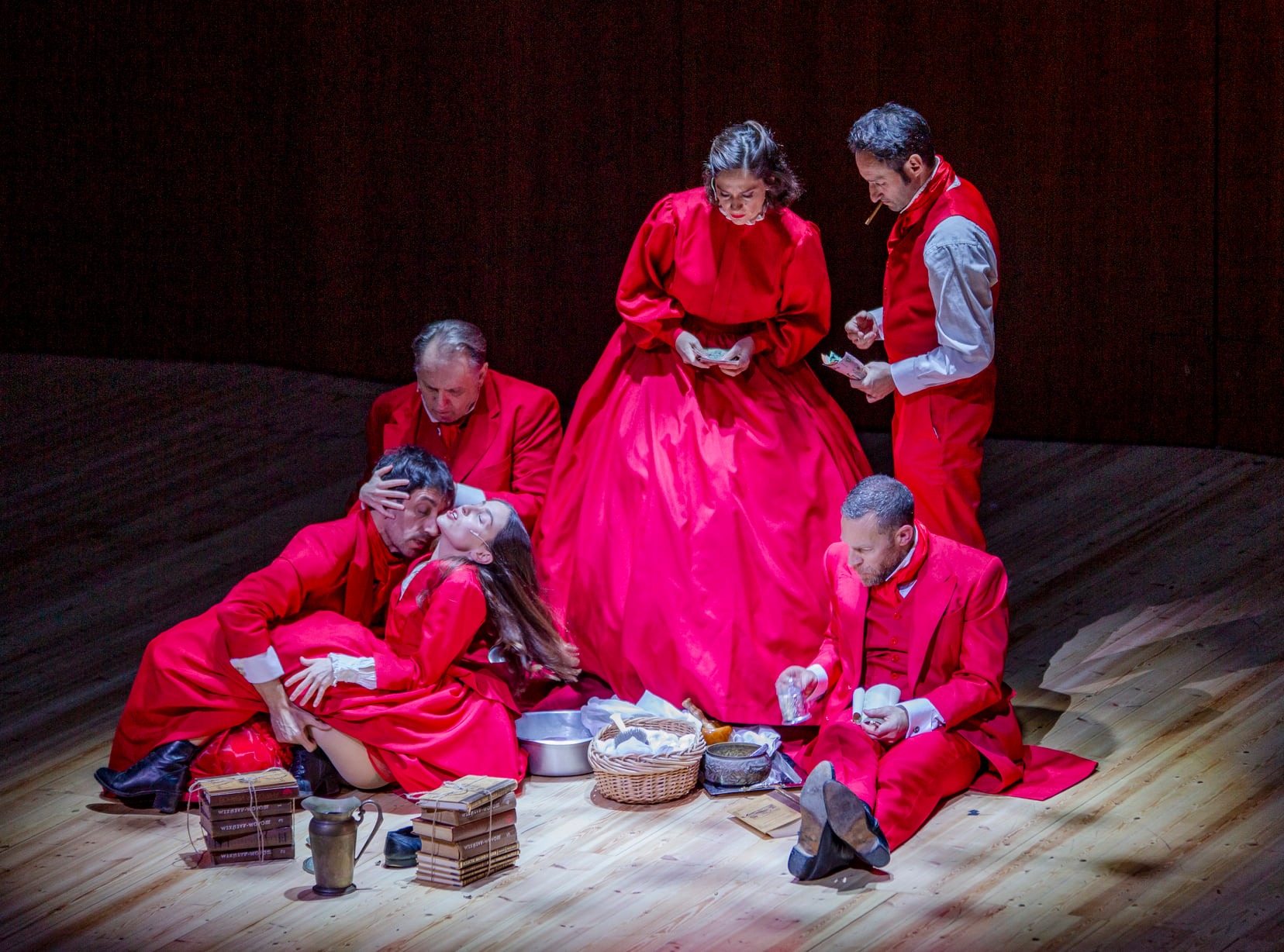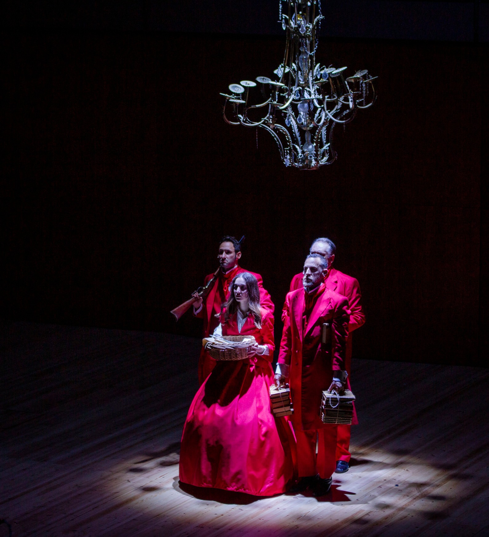 Алые силуэты на афише, в пространстве нескольких залов, которые будто перетекают друг в друга, будто нащупывают рифму, пейзаж. Эти силуэты спящие, неподвижные, заколдованные. Пурпурные аккорды из книги, текста, букв, упавших на пол в зале «Цукер», зале, который открылся зрителям в огромном здании тель-авивского «Гейхал ха-Тарбут», внизу, в андерграундовском полуподвале.