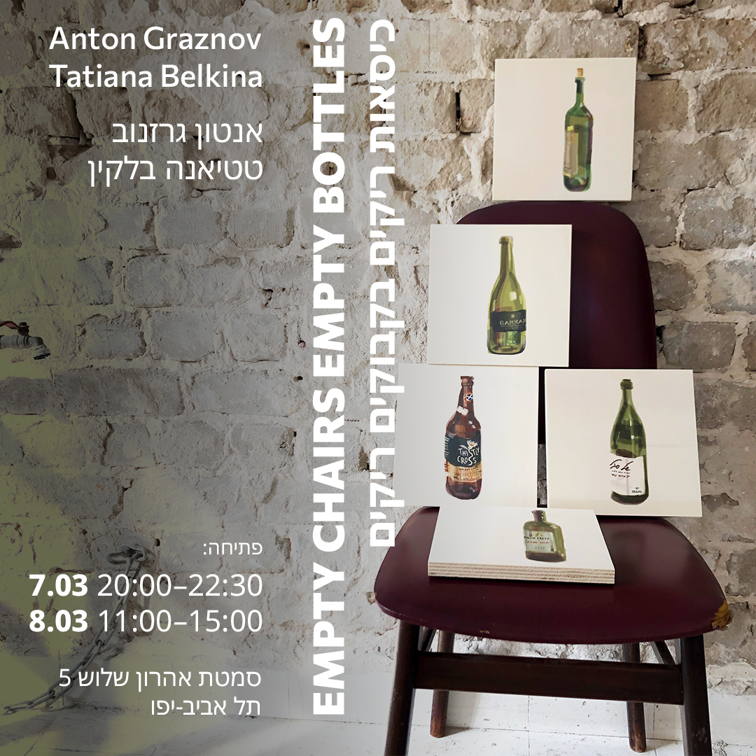 “Пустые стулья. Пустые бутылки” – выставка-дуэт художников Антона Грязнова и Татьяны Белкиной откроется в Тель Авиве 7-го и 8-го Марта .