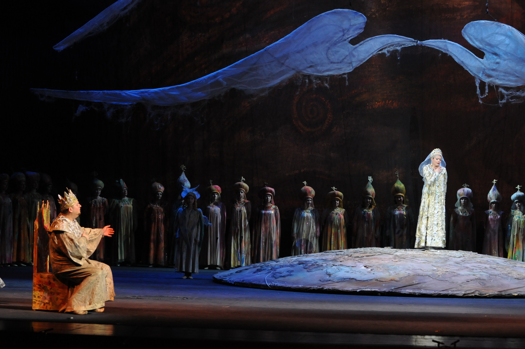 Сцена из спектакля. Царица Милитриса – Мария Лобанова, Царь Салтан – Роман Улыбин. Фото © Вадим Лапин