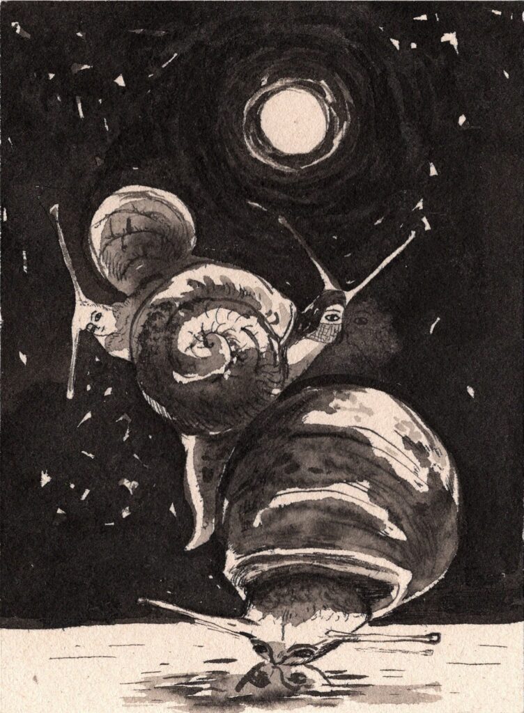 На некоторых листах улитки отражаются в воде, множатся, превращаются в подобие планет или космических тел. Их подвижные «глаза» на усиках делают образ почти инопланетным — и одновременно очень человеческим.