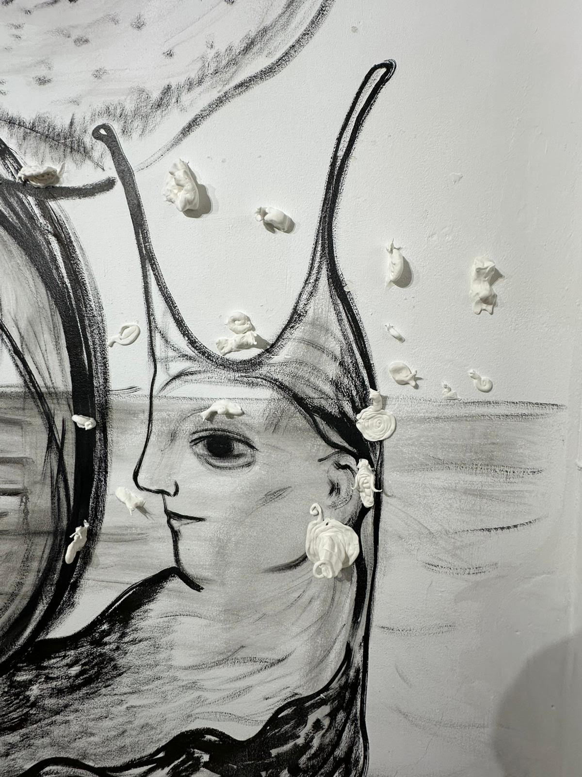 Выставка Ани Бессоновой давно была в планах галереи, и вот она предложила показать новую серию своей графики, про улиток. Для квартирной галереи камерный формат вполне органичен, но мне хочется каждой выставкой немного прыгать выше головы и экспериментировать. Поэтому, когда Аня посмотрела на стену и произнесла слово «мурал», я сразу сказала «Да!». И вот 15 графических вариаций про улитку и не только поддерживает поэтическая черно-белая композиция на стене. Микро- и макромир дополняют друг друга и делают нашу выставку зрелищной. Конечно, улитка – еще и символ «все свою ношу с собой», она везде несёт с собой свой дом и, значит, всегда дома, хотя постоянно движется. Очень точный образ миграционной жизни, который близок и всем нам, особенно тем, кто оказался здесь после 22-го года.