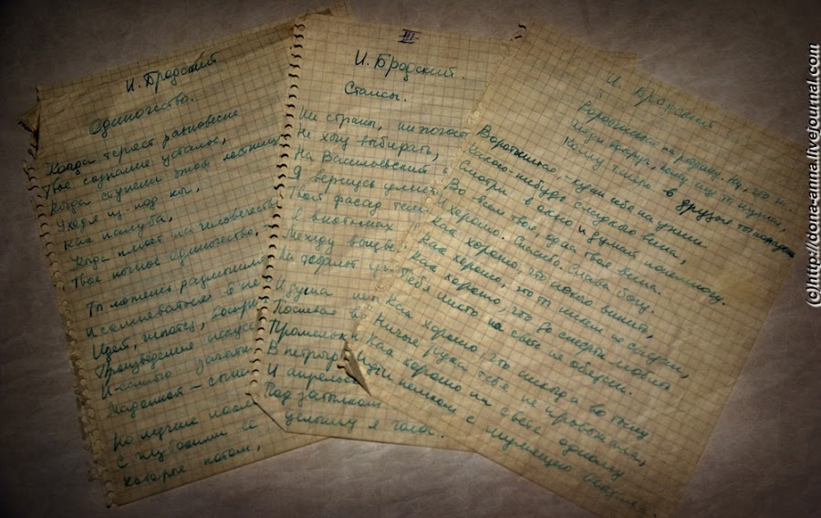 А это уже мое собственное “второе издание” стихов Бродского, напечатанное на машинке где-то в 1982 году, когда я уже работала по распределению после института… Я же ради этого научилась печатать! Как видите, бумага очень тонкая, такую специально выбирали, чтобы пробить максимальное количество копий. Например 5 или лучше все 6. Огромный тираж для себя и ближайших друзей. Сверху написано карандашом “мне”, а автор не указан. Спросите почему? Да потому что машинка была на работе, и все эти машинки были под наблюдением большого брата первого отдела, а парторг наш был известный стукач. Вполне мог увидеть, чем молодой специалист занимается в рабочее время. Но он был на столько сер, что читая нам лекцию о “жидо-масонах” не смог объяснить мне кто же такие масоны. Поэтому навешать ему лапшу на уши про какого-нибудь неизвестного поэта из национальной республики не было бы проблемой, раз автор не указан.