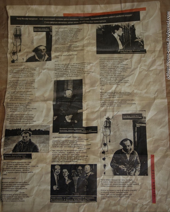 Вот вырезка из израильской газеты, не помню какой, от 7.02 1996, случайно найденная при археологических раскопках в книжном шкафу. Она посвящена кончине Иосифа Бродского. На самой нижней фотографии слева направо: А.Галич, Г.Вишневская, М.Барышников, М.Ростропович, И.Бродский. Нью-Йорк, конец 70х. Те самые невозвращенцы, которым соответствующие органы посоветовали уехать или не возвращаться и с ними один сбежавший. И так и не заплатившие той стране за свое образование. Герои нашего времени. Времени моей молодости.