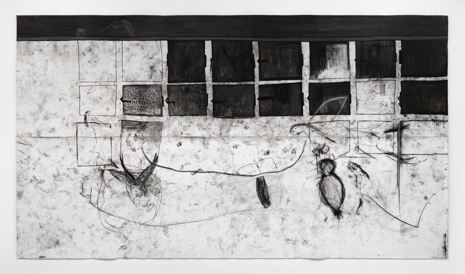 Я видела работы Марии Салех Махаммид прежде не раз – в музее «Мишкан ле-Оманут» в Эйн-Харод, в Герцлийском музее, в музее Израиля в Иерусалиме, в Художественном музее Петах-Тиквы, в галерее «Майя» в Кирьят ха-Млаха, в Доме художников в Иерусалиме, в Тель-Авивском музее искусств. Не просто видела, а запомнила когда и где. Потому и перечислила – как доказательство того, что ее работы не забываются, не стираются из памяти. Сейчас картины Марии Салех Махаммид снова можно увидеть – в том же Тель-Авивском музее искусств, где до 18 октября проходит ее персональная выставка «Умиротворение духа». Как написано в релизе «серия монументальных инсталляций, созданных в разгар войны». Огромные работы: каждый холст, сшитый из дюжины кусков ткани, – размером с киноэкран. На холстах, полных драмы и пронизанными тайнами – рассказ, повесть, исповедь. То, что нужно выплеснуть – то, что нужно поведать. То, что необходимо рассказать и показать так, как умеет Мария Салех Махаммид, которая рисует углем, практически танцуя на холсте, оставляя на нем отпечатки рук, ног, стоп, всего тела, взаимодействуя с материалом физически, в буквальном смысле оставляя свой отпечаток – отпечаток тела и души. Суфийский танец на монументальном холсте. Хореограф и солистка – сама же художница. Темы: внешний хаос и внутренний покой, идентичность, материнство, телесная и духовная уязвимость, семейные истории, изгнание и насилие, память тела, биография ее отца и его политическая деятельность, личные переживания и коллективные травмы, включая палестино-израильский конфликт и войну в Украине. Выставка называется «Раxат ар-Рух» на арабском, или «Нахат ха-руах» на иврите. На арабском «Раxат ар-Рух» означает что-то вроде «покой духа».