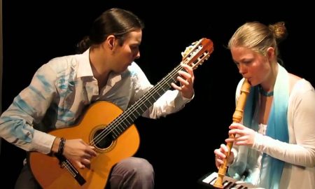 На фото – гитарист Бобби Рутвельд и флейтистка Санна Ван Эльст. © Самсонг продакшн Гитара и флейта – традиционный инструментальный дуэт, популярный...