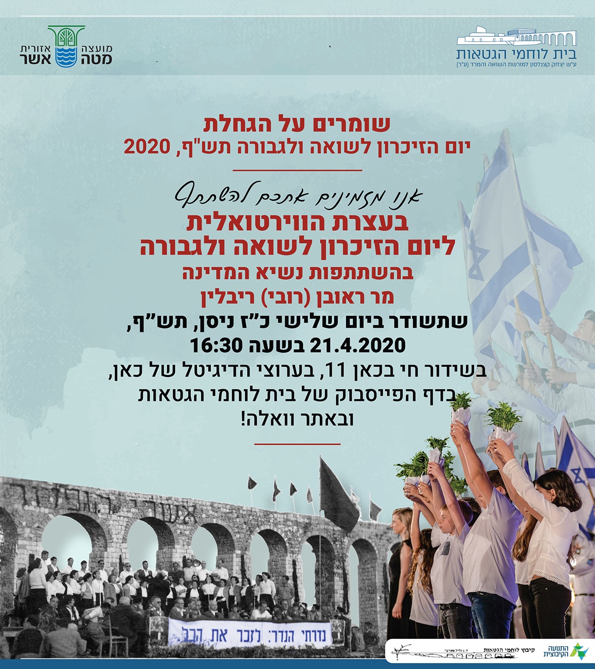 По инициативе музея «Бейт Лохамей ха-Гетаот» и регионального совета Матэ Ашер в Западной Галилее, сотни тысяч человек из Израиля и всего мира смогут принять участие в виртуальном митинге «Сохраним огонь в наших сердцах», посвященном Дню памяти жертв Катастрофы.