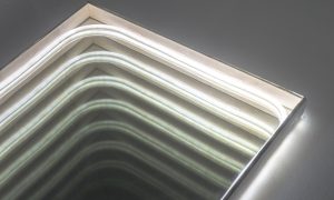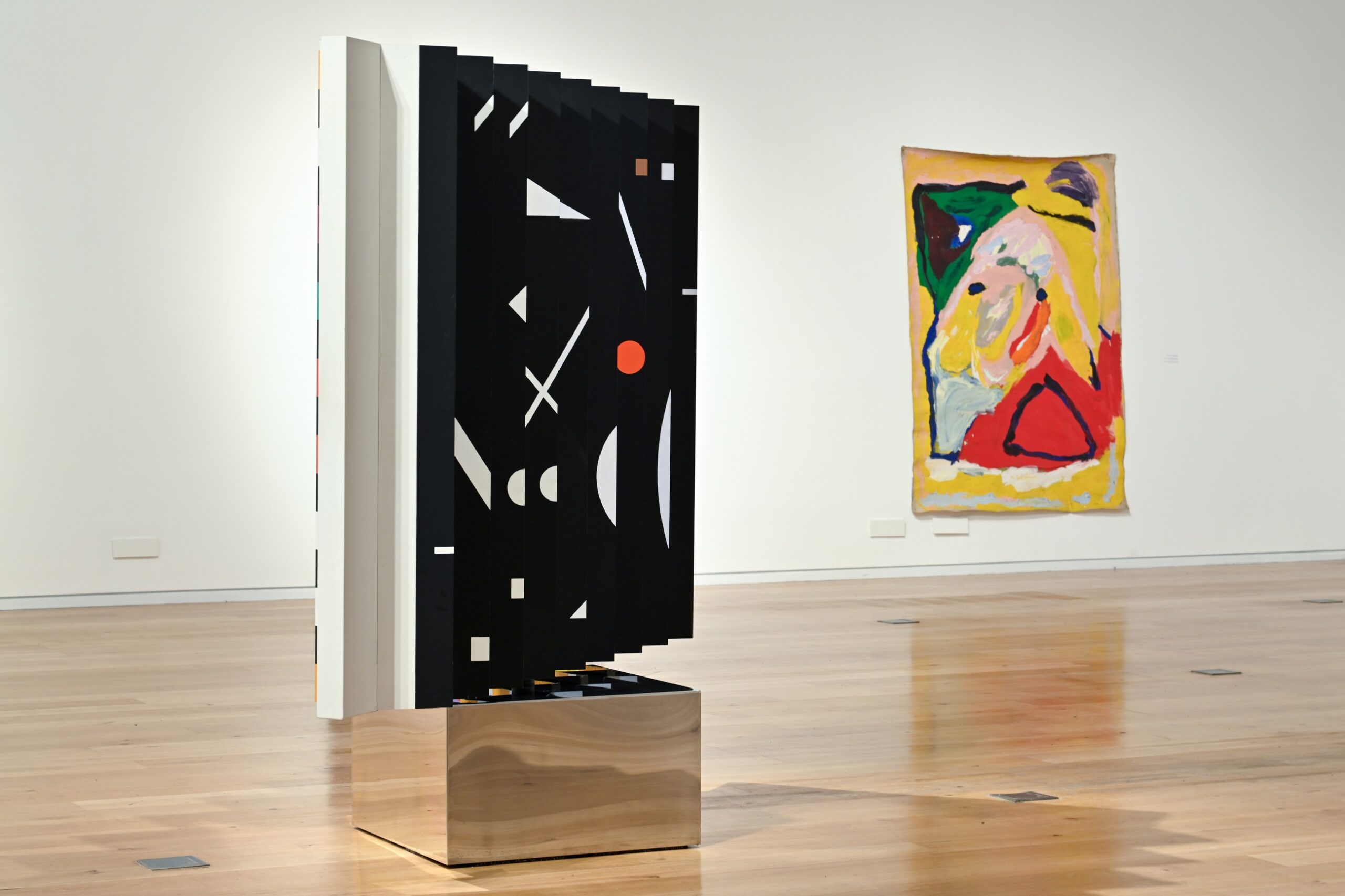 Эта идея особенно ясно воплощена в скульптуре «По ту сторону» (Beyond), находящейся в центре текущей выставки. Скульптура вращается вокруг своей оси и может быть увидена со всех сторон и под разными углами. Её движение и цветовая гамма отсылают к переходу от ночной тишины к дневной суете, а также к циклическому движению времён года: с одной стороны – дневные оттенки белого и жёлтого, с другой – чёрный фон с белыми формами и оранжевым кругом, напоминающим заходящее солнце; между ними – постепенная трансформация форм и богатый спектр цветов.