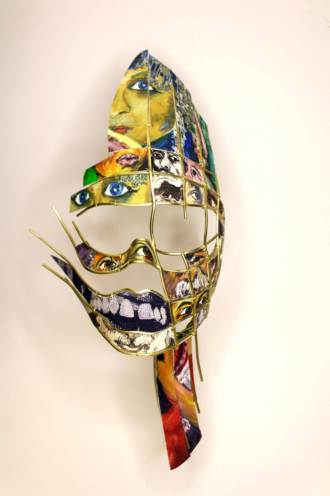 עומרי גורן, מסיכה, 2022, מוטות פליז בציפוי זהב 18 קראט ושיבוץ שברי ציורים מודפסים על בד. צילום-גילי קאטי. Омри Горен, Маска, 2022, латунные стержни с покрытием из 18-каратного золота и инкрустация фрагментами картин, напечатанных на холсте. Фото Гили Кати